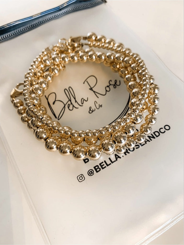 Made with 14K Gold-Filled beads and a durable elastic for a comfortable stretch to roll on and off your wrist OR choose to style up with our clasp finish and findings