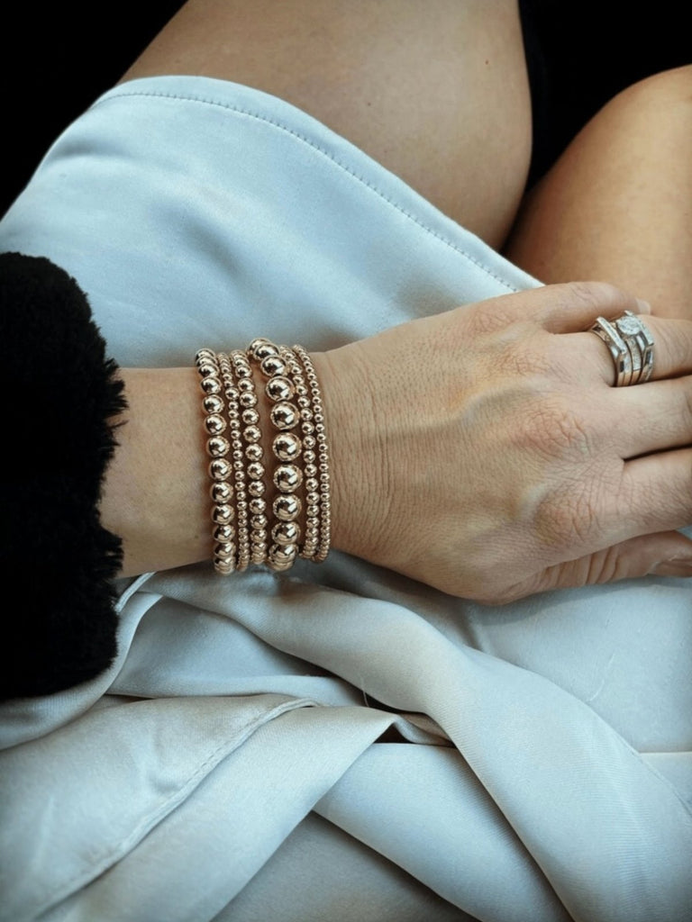 Made with 14K Gold-Filled beads and a durable elastic for a comfortable stretch to roll on and off your wrist OR choose to style up with our clasp finish and findings