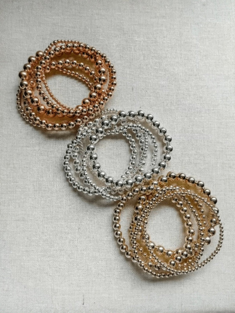 Bracelet stack of 6 includes: 2 Bella Signature 3mm, 1 Bella Signature 4mm, 1 Bella Signature 5mm, 1 Bella Signature 6mm, 1 Bella Signature 8mm