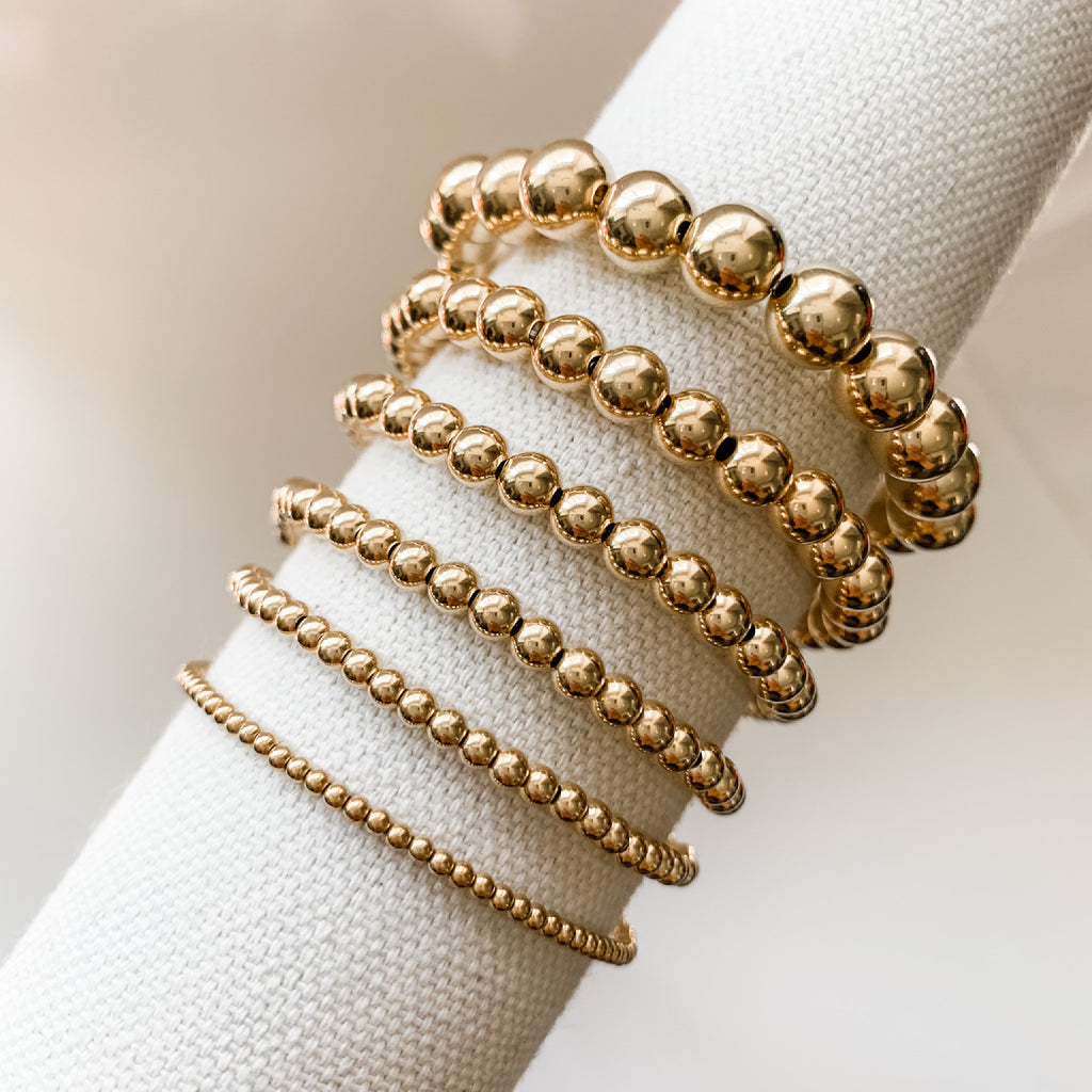 Made with 14K Gold-Filled beads and a durable elastic for a comfortable stretch to roll on and off your wrist OR choose to style up with our clasp finish and findings
