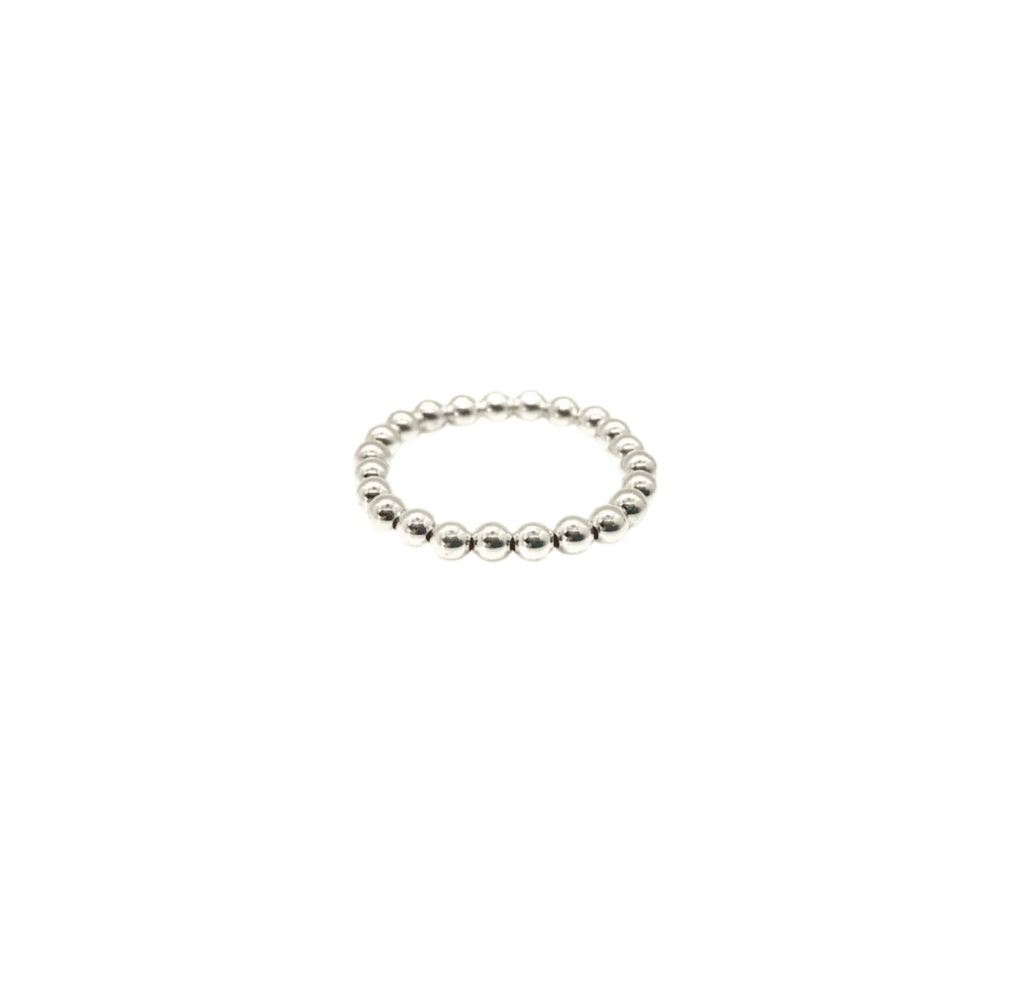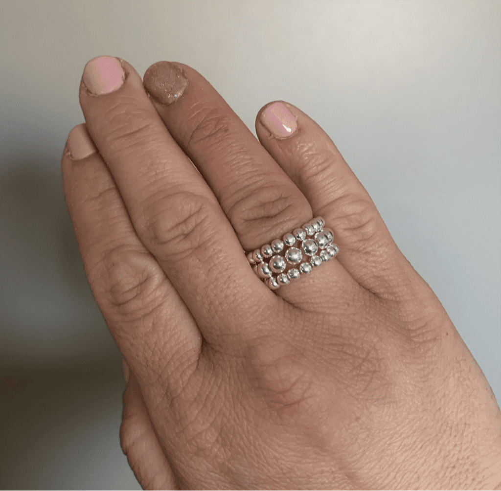 Made with Sterling Silver beads and a durable elastic for a comfortable stretch to roll on and off your finger
